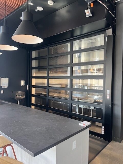In November of 2024, we installed this commercial overhead door in the food accelerator area of the Riverwest Apartments in Milwaukee, WI! The overhead door we installed is a gorgeous Clopay VertiStack Clear Door and helps to showcase the kitchen hidden behind the door.
